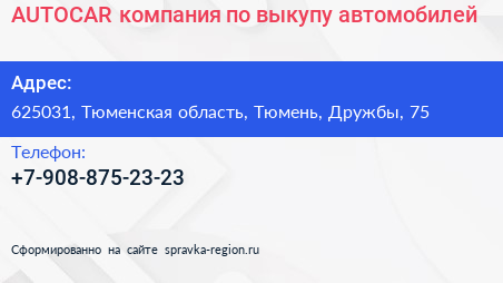 AUTOCAR, компания по выкупу автомобилей по адресу 625031, Тюменская область, Тюмень, Дружбы, 75 в дальнейшем Организация, размещена в следующих категориях:
