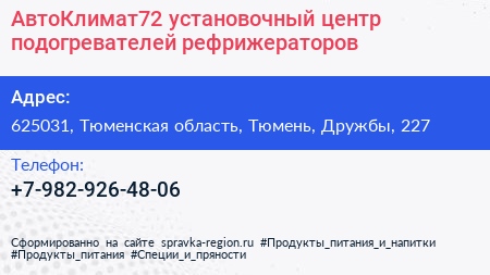 АвтоКлимат72, установочный центр подогревателей, рефрижераторов по адресу 625031, Тюменская область, Тюмень, Дружбы, 227 в дальнейшем Организация, размещена в следующих категориях: