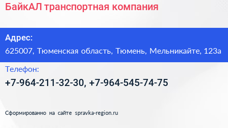 БайкАЛ, транспортная компания по адресу 625007, Тюменская область, Тюмень, Мельникайте, 123а в дальнейшем Организация, размещена в следующих категориях: