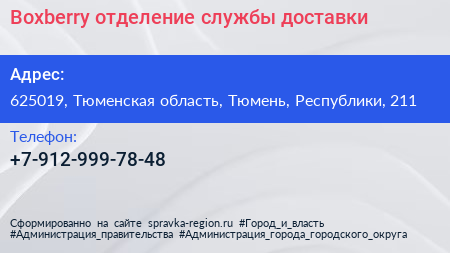 Boxberry, отделение службы доставки по адресу 625019, Тюменская область, Тюмень, Республики, 211 в дальнейшем Организация, размещена в следующих категориях: