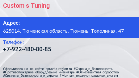 Custom`s Tuning по адресу 625014, Тюменская область, Тюмень, Тополиная, 47 в дальнейшем Организация, размещена в следующих категориях:
