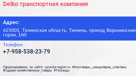 Delko, транспортная компания по адресу 625001, Тюменская область, Тюмень, проезд Воронинские горки, 160 в дальнейшем Организация, размещена в следующих категориях: