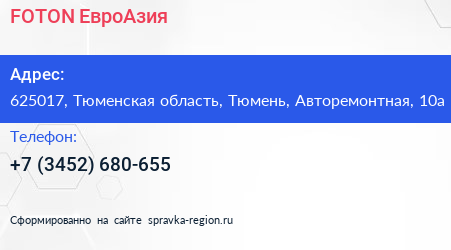 FOTON ЕвроАзия по адресу 625017, Тюменская область, Тюмень, Авторемонтная, 10а в дальнейшем Организация, размещена в следующих категориях: