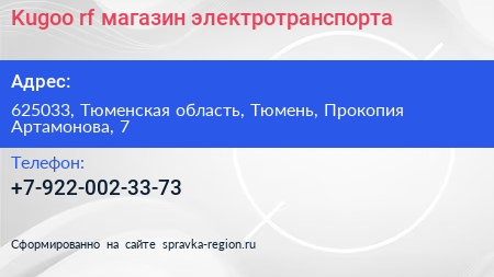Kugoo-rf, магазин электротранспорта по адресу 625033, Тюменская область, Тюмень, Прокопия Артамонова, 7 в дальнейшем Организация, размещена в следующих категориях: