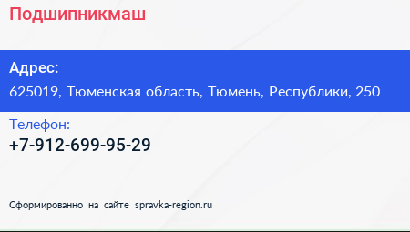 Подшипникмаш по адресу 625019, Тюменская область, Тюмень, Республики, 250 в дальнейшем Организация, размещена в следующих категориях: