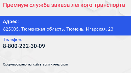 Премиум, служба заказа легкого транспорта по адресу 625005, Тюменская область, Тюмень, Игарская, 23 в дальнейшем Организация, размещена в следующих категориях:
