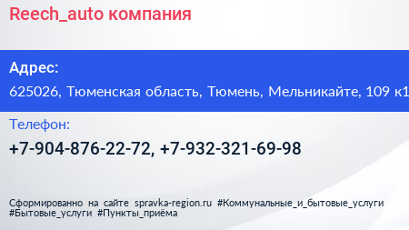 Reech_auto, компания по адресу 625026, Тюменская область, Тюмень, Мельникайте, 109 к1 в дальнейшем Организация, размещена в следующих категориях: