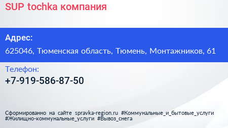 SUP.tochka, компания по адресу 625046, Тюменская область, Тюмень, Монтажников, 61 в дальнейшем Организация, размещена в следующих категориях: