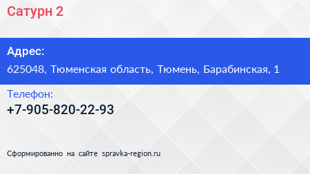 Сатурн-2 по адресу 625048, Тюменская область, Тюмень, Барабинская, 1 в дальнейшем Организация, размещена в следующих категориях: