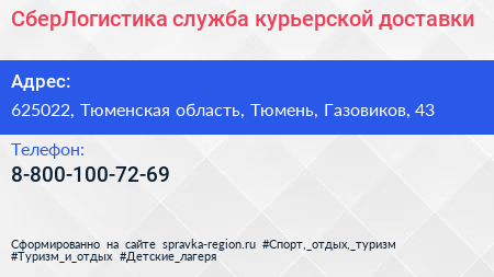 СберЛогистика, служба курьерской доставки по адресу 625022, Тюменская область, Тюмень, Газовиков, 43 в дальнейшем Организация, размещена в следующих категориях: