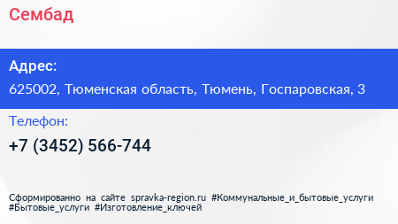 Сембад по адресу 625002, Тюменская область, Тюмень, Госпаровская, 3 в дальнейшем Организация, размещена в следующих категориях:
