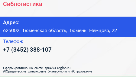 Сиблогистика по адресу 625002, Тюменская область, Тюмень, Немцова, 22 в дальнейшем Организация, размещена в следующих категориях: