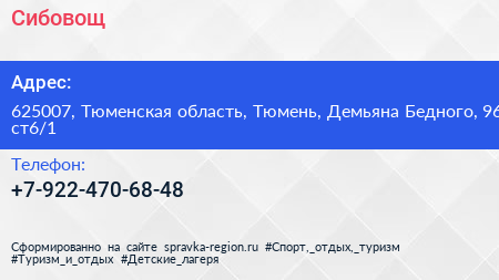 Сибовощ по адресу 625007, Тюменская область, Тюмень, Демьяна Бедного, 96 ст6/1 в дальнейшем Организация, размещена в следующих категориях: