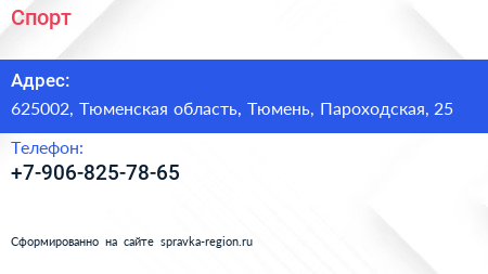 Спорт по адресу 625002, Тюменская область, Тюмень, Пароходская, 25 в дальнейшем Организация, размещена в следующих категориях: