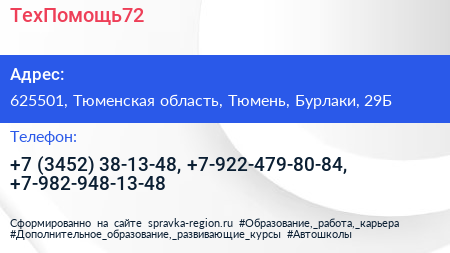 ТехПомощь72 по адресу 625501, Тюменская область, Тюмень, Бурлаки, 29Б в дальнейшем Организация, размещена в следующих категориях:
