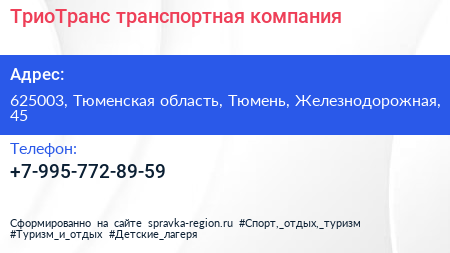 ТриоТранс, транспортная компания по адресу 625003, Тюменская область, Тюмень, Железнодорожная, 45 в дальнейшем Организация, размещена в следующих категориях: