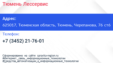 Тюмень-Лессервис по адресу 625017, Тюменская область, Тюмень, Черепанова, 76 ст6 в дальнейшем Организация, размещена в следующих категориях: