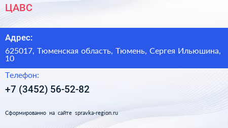 ЦАВС по адресу 625017, Тюменская область, Тюмень, Сергея Ильюшина, 10 в дальнейшем Организация, размещена в следующих категориях: