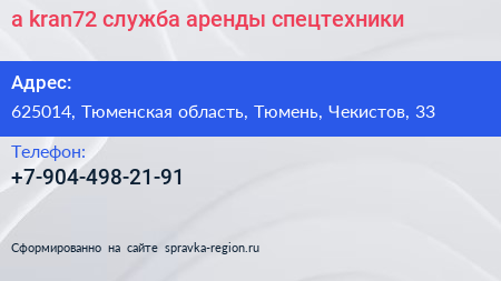 a-kran72, служба аренды спецтехники по адресу 625014, Тюменская область, Тюмень, Чекистов, 33 в дальнейшем Организация, размещена в следующих категориях: