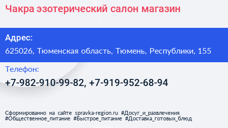 Чакра, эзотерический салон-магазин по адресу 625026, Тюменская область, Тюмень, Республики, 155 в дальнейшем Организация, размещена в следующих категориях: