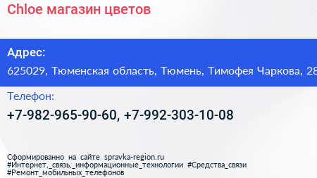 Chloe, магазин цветов по адресу 625029, Тюменская область, Тюмень, Тимофея Чаркова, 28 в дальнейшем Организация, размещена в следующих категориях:
