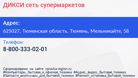 ДИКСИ, сеть супермаркетов по адресу 625027, Тюменская область, Тюмень, Мельникайте, 58 в дальнейшем Организация, размещена в следующих категориях: