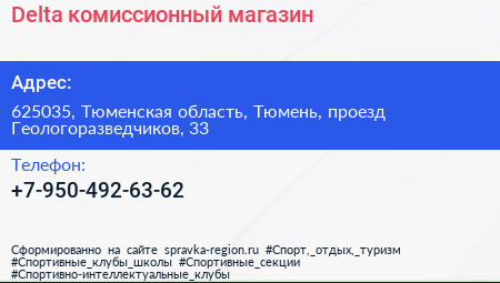 Delta, комиссионный магазин по адресу 625035, Тюменская область, Тюмень, проезд Геологоразведчиков, 33 в дальнейшем Организация, размещена в следующих категориях: