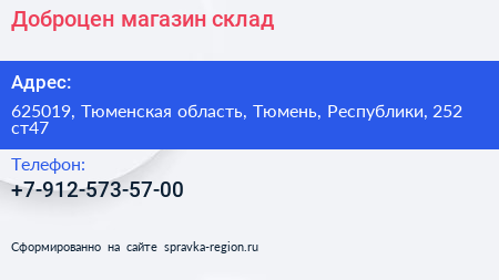 Доброцен, магазин-склад по адресу 625019, Тюменская область, Тюмень, Республики, 252 ст47 в дальнейшем Организация, размещена в следующих категориях: