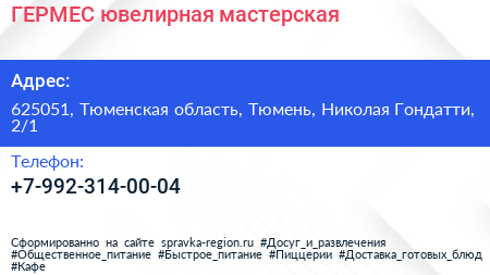ГЕРМЕС, ювелирная мастерская по адресу 625051, Тюменская область, Тюмень, Николая Гондатти, 2/1 в дальнейшем Организация, размещена в следующих категориях: