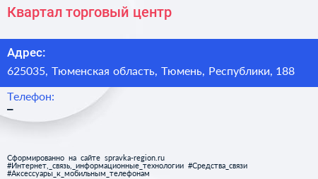 Квартал, торговый центр по адресу 625035, Тюменская область, Тюмень, Республики, 188 в дальнейшем Организация, размещена в следующих категориях: