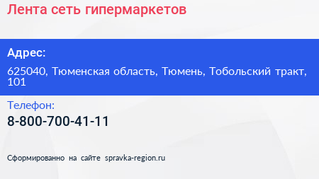 Лента, сеть гипермаркетов по адресу 625040, Тюменская область, Тюмень, Тобольский тракт, 101 в дальнейшем Организация, размещена в следующих категориях: