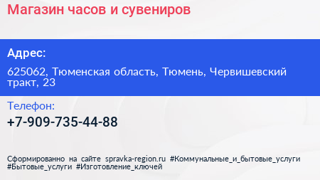 Магазин часов и сувениров по адресу 625062, Тюменская область, Тюмень, Червишевский тракт, 23 в дальнейшем Организация, размещена в следующих категориях: