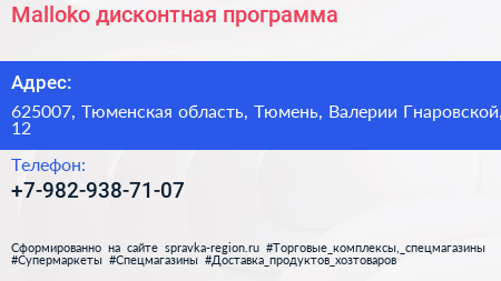 Malloko, дисконтная программа по адресу 625007, Тюменская область, Тюмень, Валерии Гнаровской, 12 в дальнейшем Организация, размещена в следующих категориях: