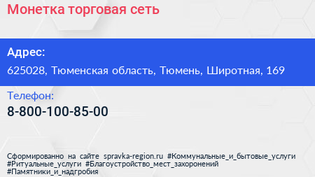 Монетка, торговая сеть по адресу 625028, Тюменская область, Тюмень, Широтная, 169 в дальнейшем Организация, размещена в следующих категориях: