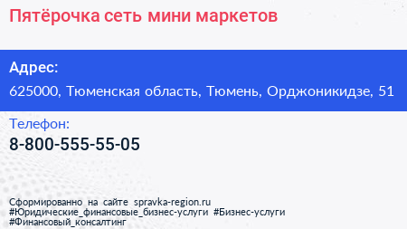 Пятёрочка, сеть мини-маркетов по адресу 625000, Тюменская область, Тюмень, Орджоникидзе, 51 в дальнейшем Организация, размещена в следующих категориях: