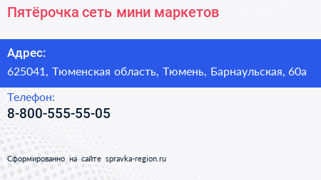 Пятёрочка, сеть мини-маркетов по адресу 625041, Тюменская область, Тюмень, Барнаульская, 60а в дальнейшем Организация, размещена в следующих категориях: