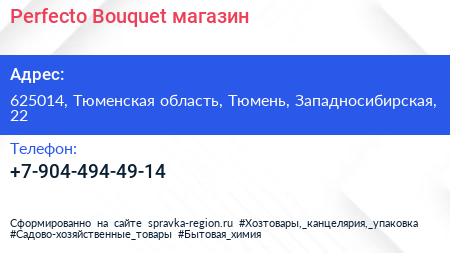 Perfecto Bouquet, магазин по адресу 625014, Тюменская область, Тюмень, Западносибирская, 22 в дальнейшем Организация, размещена в следующих категориях: