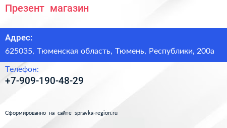 Презент+, магазин по адресу 625035, Тюменская область, Тюмень, Республики, 200а в дальнейшем Организация, размещена в следующих категориях: