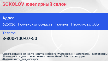 SOKOLOV, ювелирный салон по адресу 625016, Тюменская область, Тюмень, Пермякова, 50Б в дальнейшем Организация, размещена в следующих категориях: