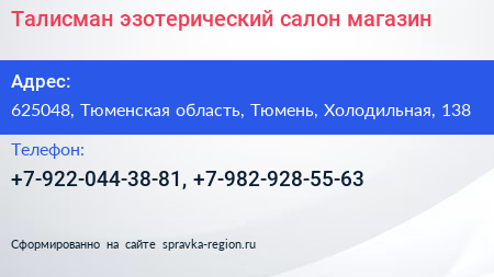 Талисман, эзотерический салон-магазин по адресу 625048, Тюменская область, Тюмень, Холодильная, 138 в дальнейшем Организация, размещена в следующих категориях: