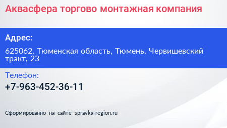 Аквасфера, торгово-монтажная компания по адресу 625062, Тюменская область, Тюмень, Червишевский тракт, 23 в дальнейшем Организация, размещена в следующих категориях: