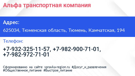 Альфа, транспортная компания по адресу 625034, Тюменская область, Тюмень, Камчатская, 194 в дальнейшем Организация, размещена в следующих категориях: