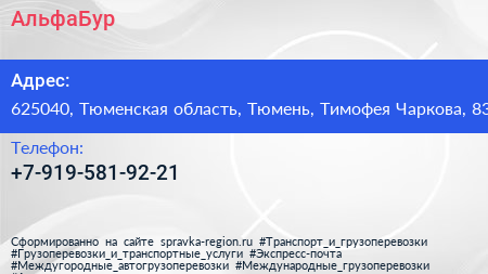 АльфаБур по адресу 625040, Тюменская область, Тюмень, Тимофея Чаркова, 83 в дальнейшем Организация, размещена в следующих категориях: