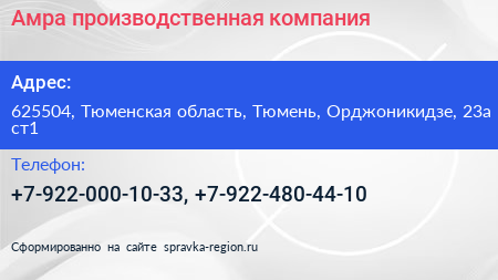 Амра, производственная компания по адресу 625504, Тюменская область, Тюмень, Орджоникидзе, 23а ст1 в дальнейшем Организация, размещена в следующих категориях: