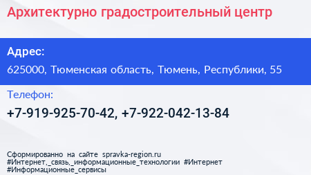 Архитектурно-градостроительный центр по адресу 625000, Тюменская область, Тюмень, Республики, 55 в дальнейшем Организация, размещена в следующих категориях: