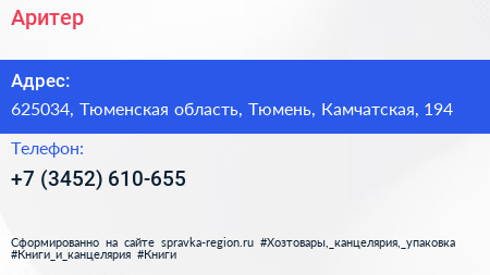Аритер по адресу 625034, Тюменская область, Тюмень, Камчатская, 194 в дальнейшем Организация, размещена в следующих категориях: