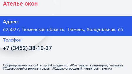 Ателье окон по адресу 625027, Тюменская область, Тюмень, Холодильная, 65 в дальнейшем Организация, размещена в следующих категориях: