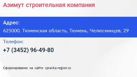 Азимут, строительная компания по адресу 625000, Тюменская область, Тюмень, Челюскинцев, 29 в дальнейшем Организация, размещена в следующих категориях: