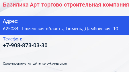 Базилика Арт, торгово-строительная компания по адресу 625034, Тюменская область, Тюмень, Дамбовская, 10 в дальнейшем Организация, размещена в следующих категориях: