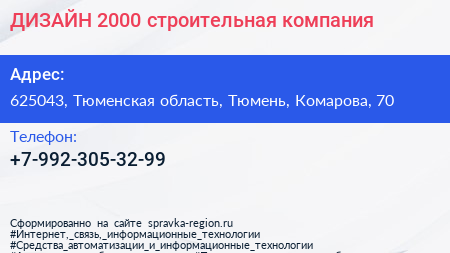 ДИЗАЙН-2000, строительная компания по адресу 625043, Тюменская область, Тюмень, Комарова, 70 в дальнейшем Организация, размещена в следующих категориях: